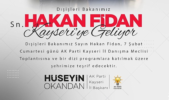 "Dışişleri Bakanımız Hakan Fidan Kayseri'ye geliyor. Dışişleri Bakanımız Hakan Fidan, 7 Şubat Cumartesi günü AK Parti Kayseri İl Danışma Meclisi Toplantısı’na ve bir dizi programlara katılmak üzere şehrimize teşrif edecektir."